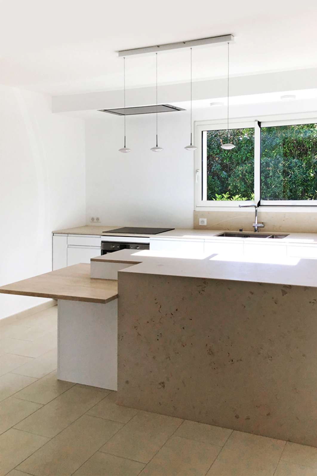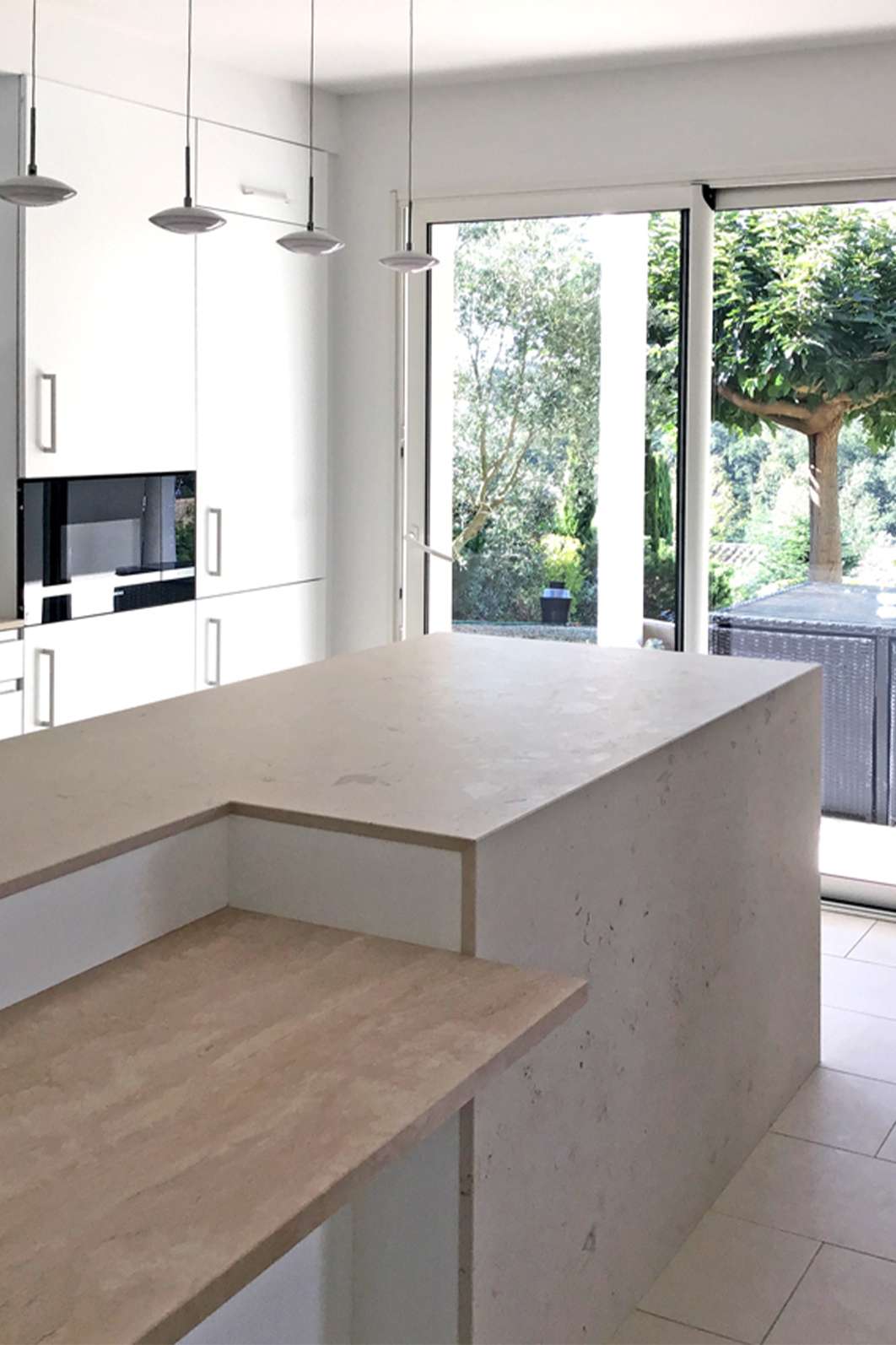 Ce projet devait relever plusieurs défis à première vue contradictoires. La cliente, très attachée à la couleur blanche, avait envie d’un aménagement très sobre, extrêmement facile d’entretien et fonctionnel tout en amenant du caractère et nouveauté à son intérieur. Le parti pris était d’utiliser des modules de mobilier en blanc laqué, adaptés autant pour la cuisine que pour le séjour. L’ensemble est relevé par un jeu de deux pierres aux caractères complémentaires, aussi présents que raffinés. L’ensemble est mis en oeuvre de façon soigneuse et complété par des équipements de qualité.